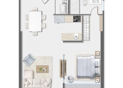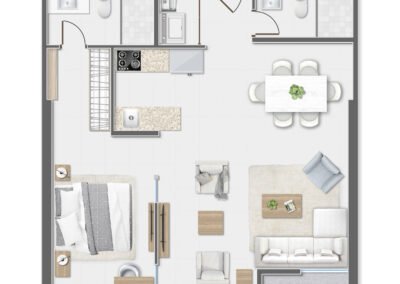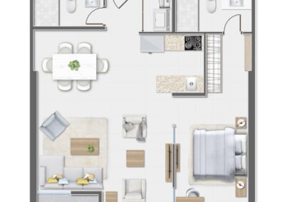 - Disponibles en dos modelos: 56 m² (1 recámara) y 64 m² (1 recámara con opción a 2da)