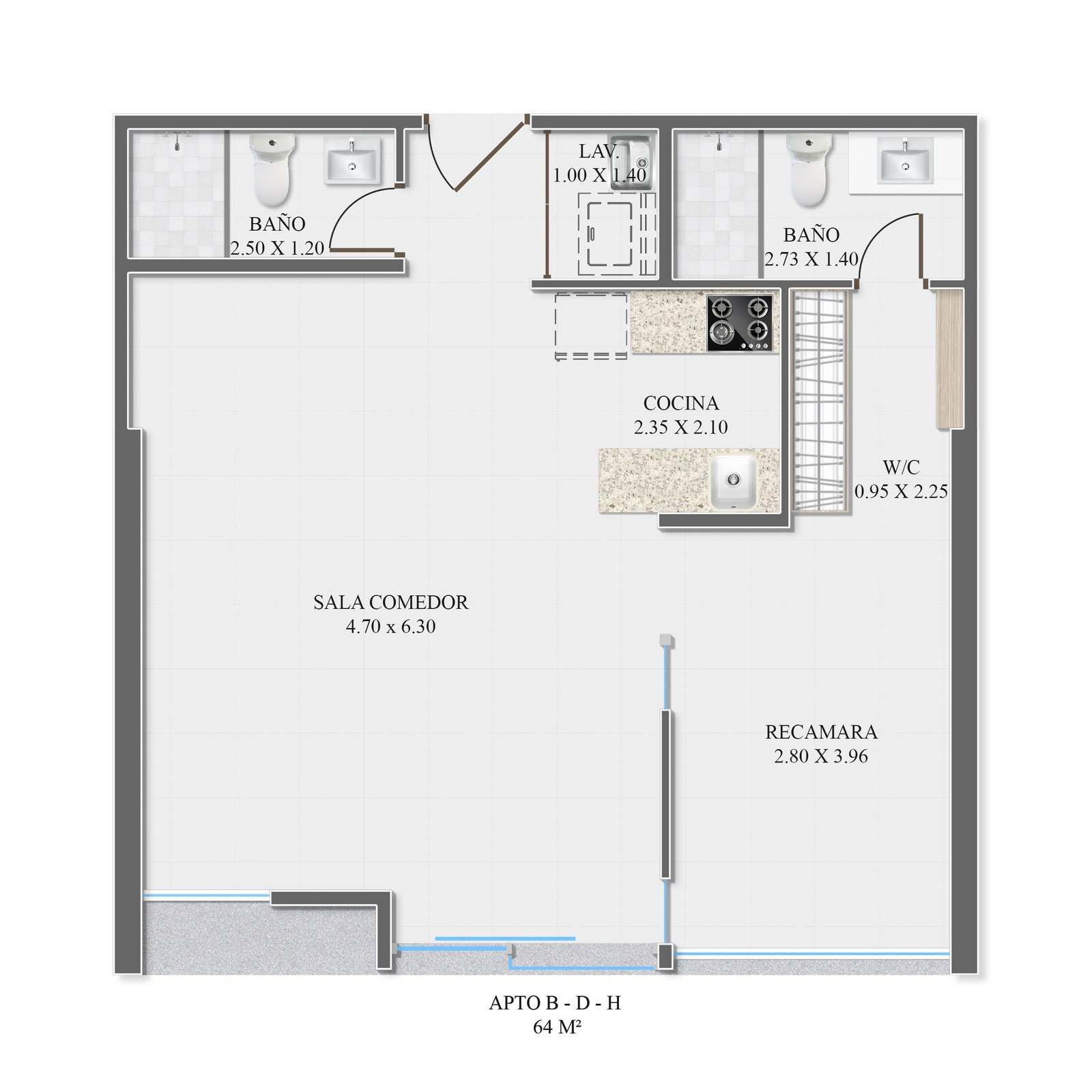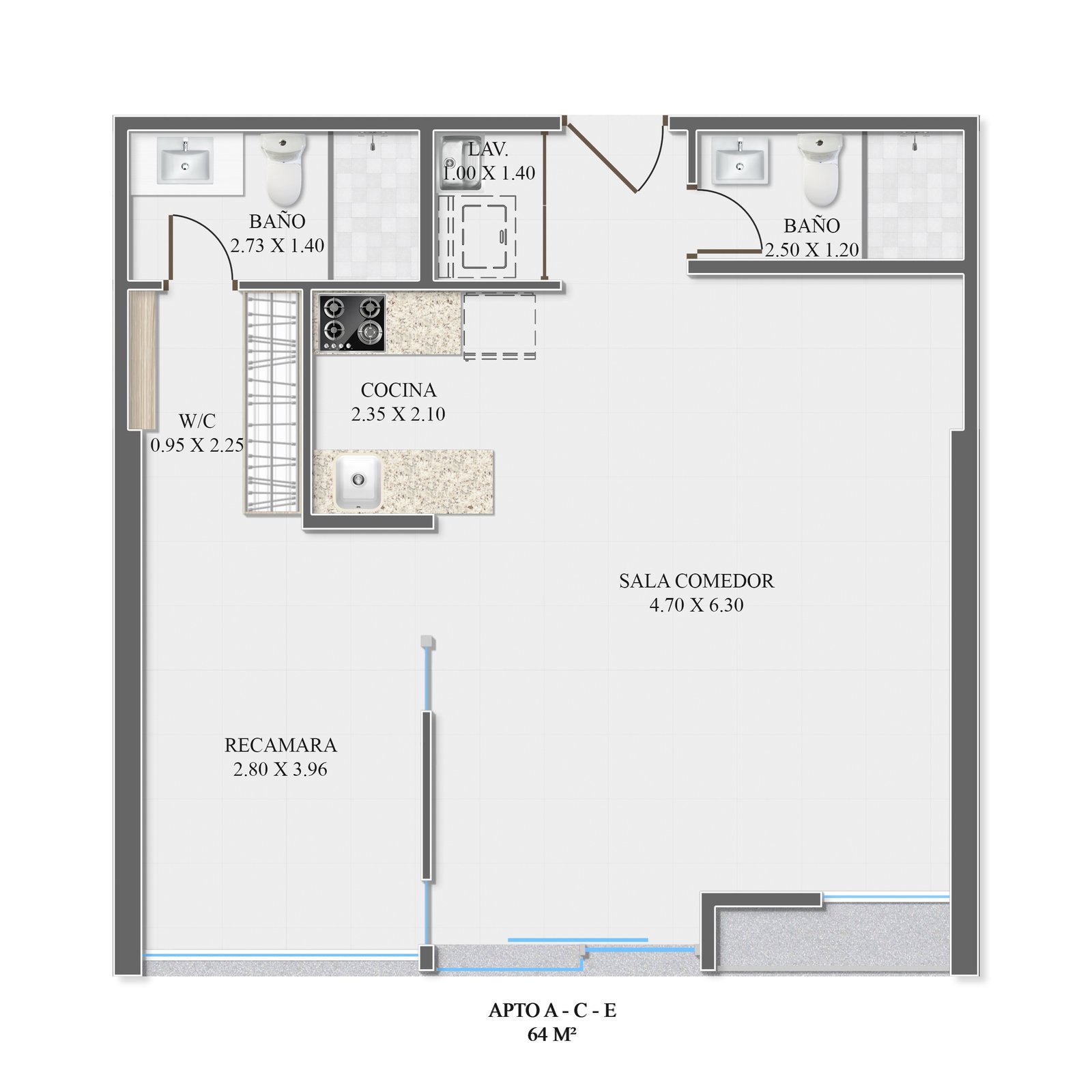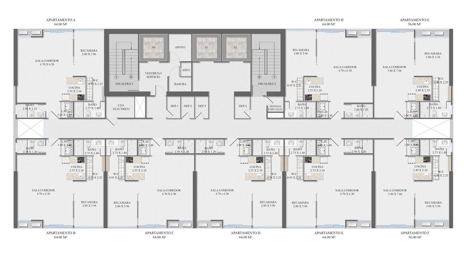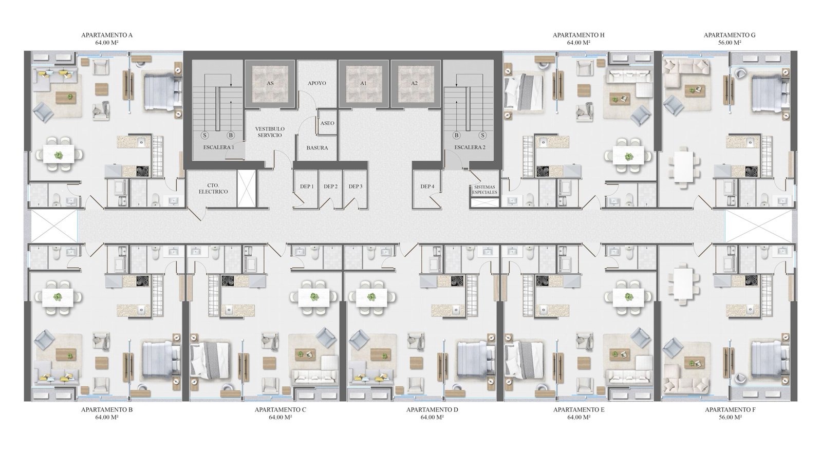 - Baños completos (1 en unidades de 56 m²; 2 en unidades de 64 m²)