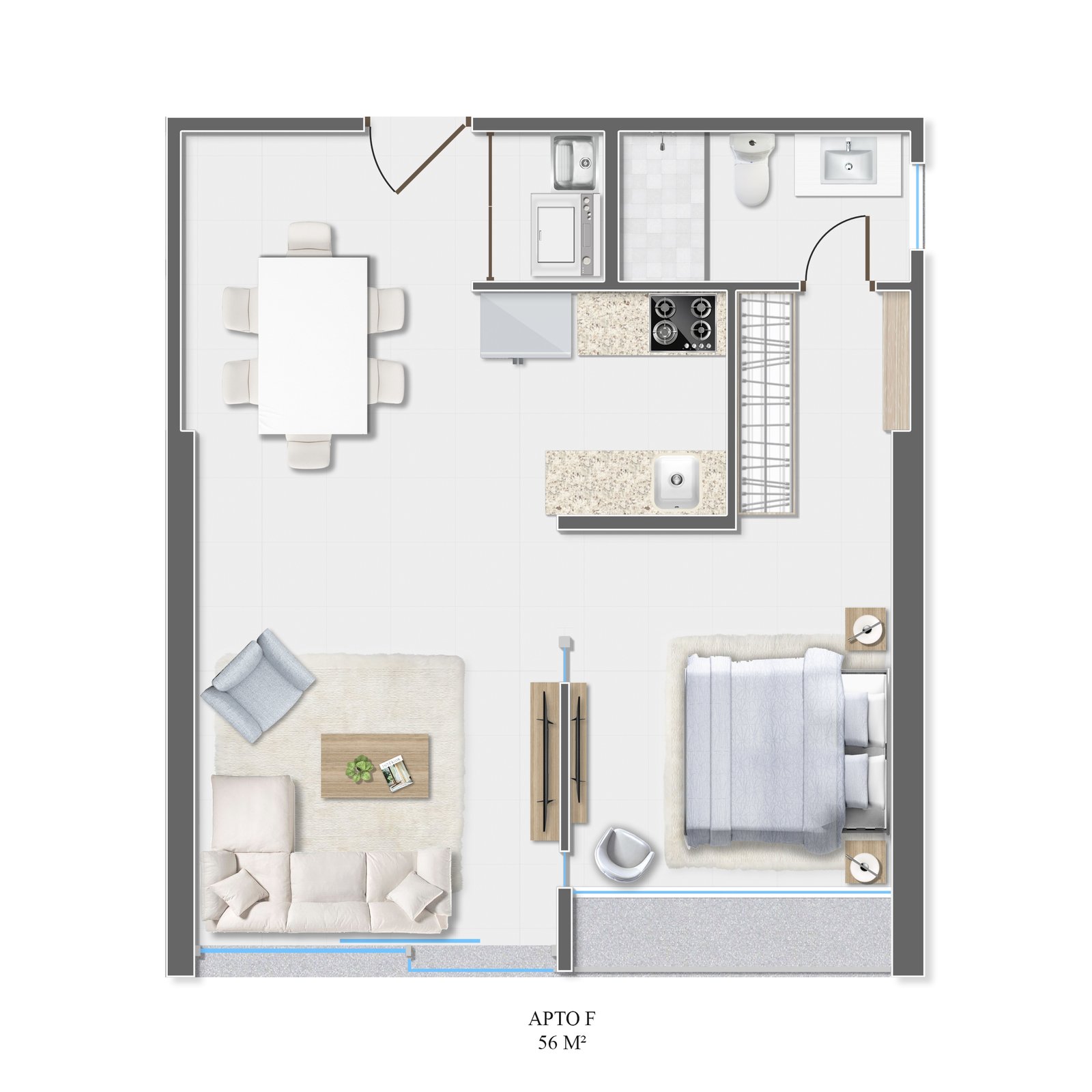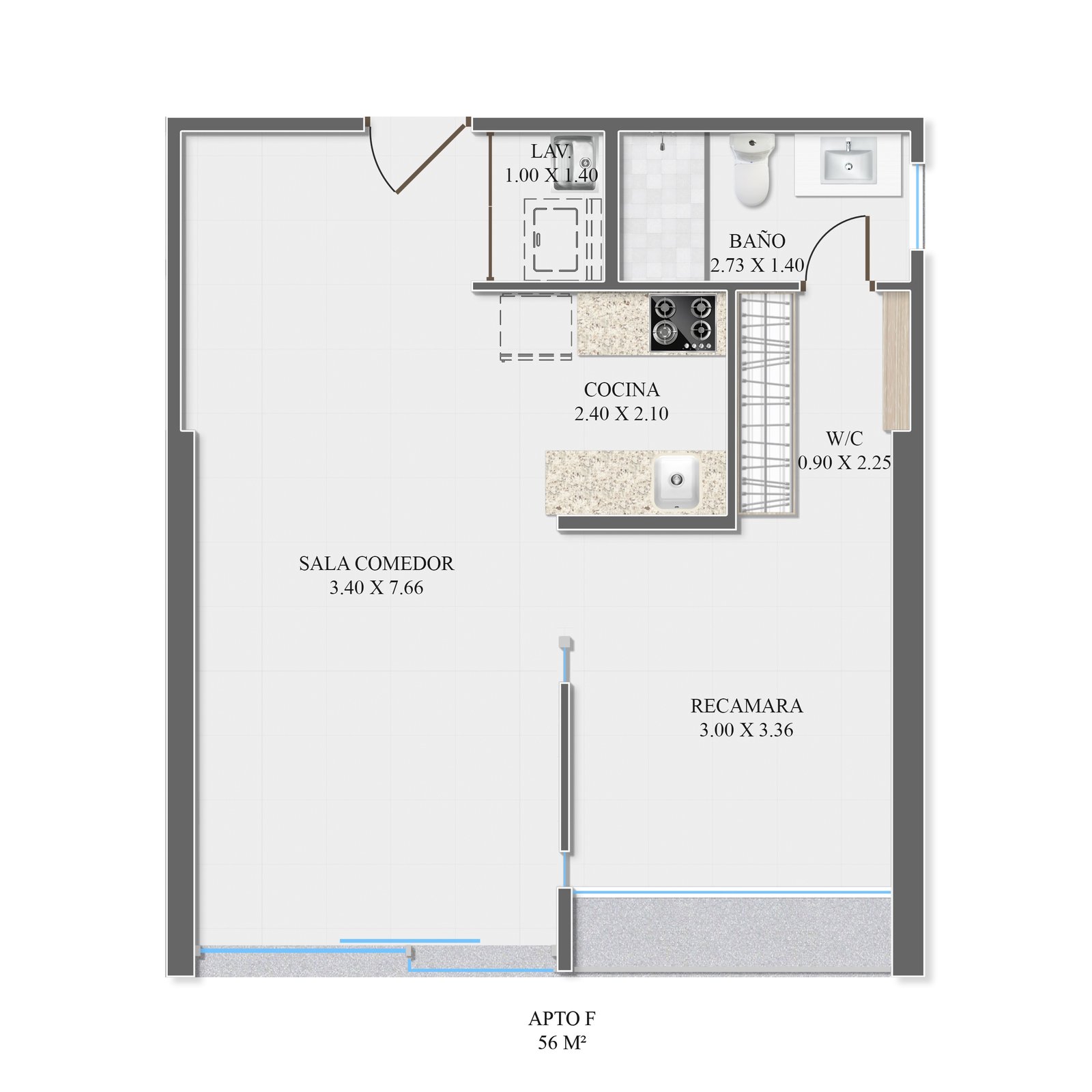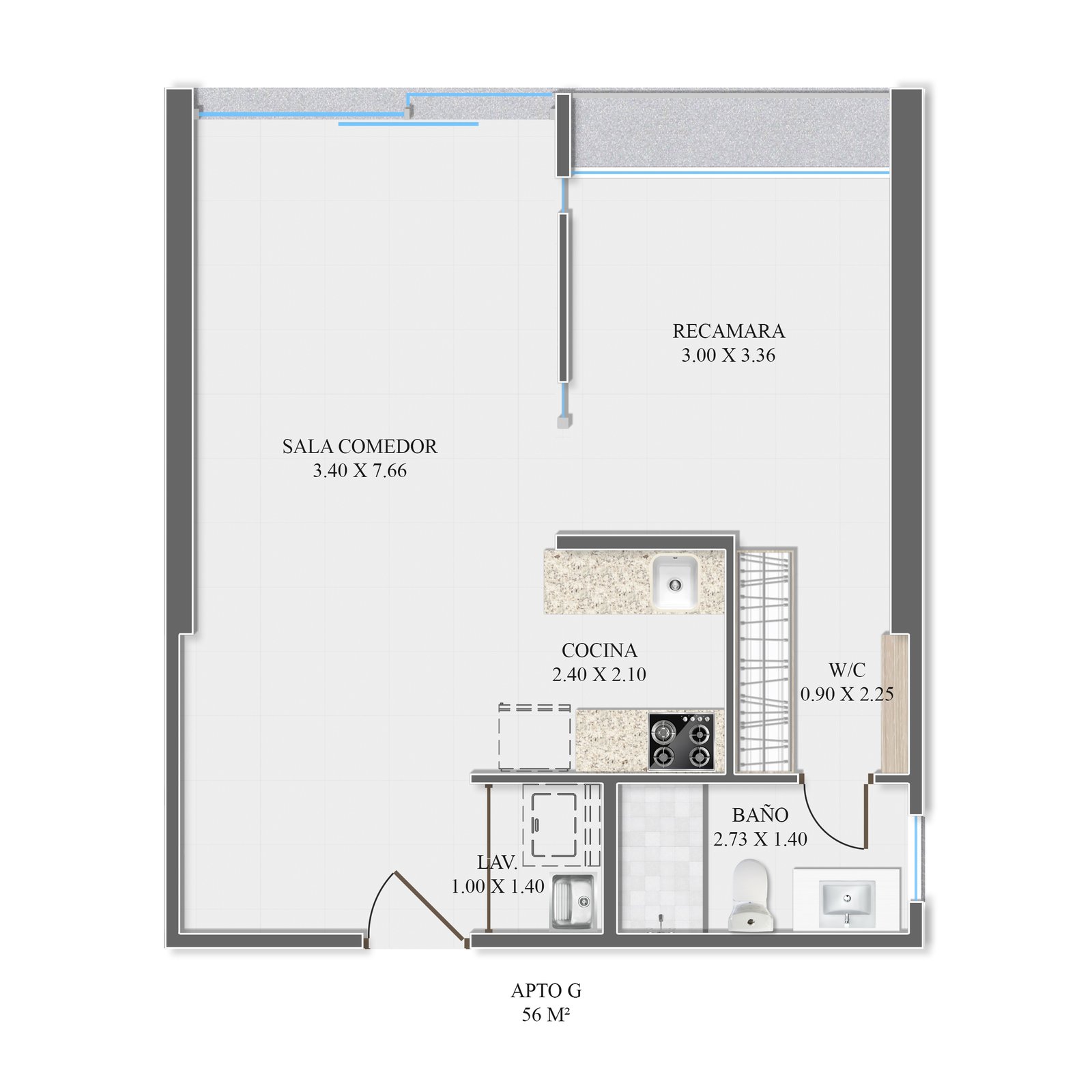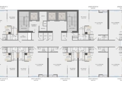 - Baños completos (1 en unidades de 56 m²; 2 en unidades de 64 m²)