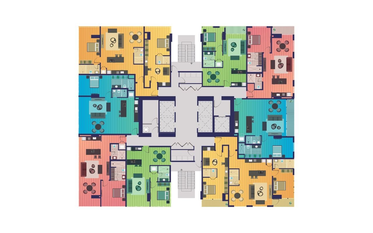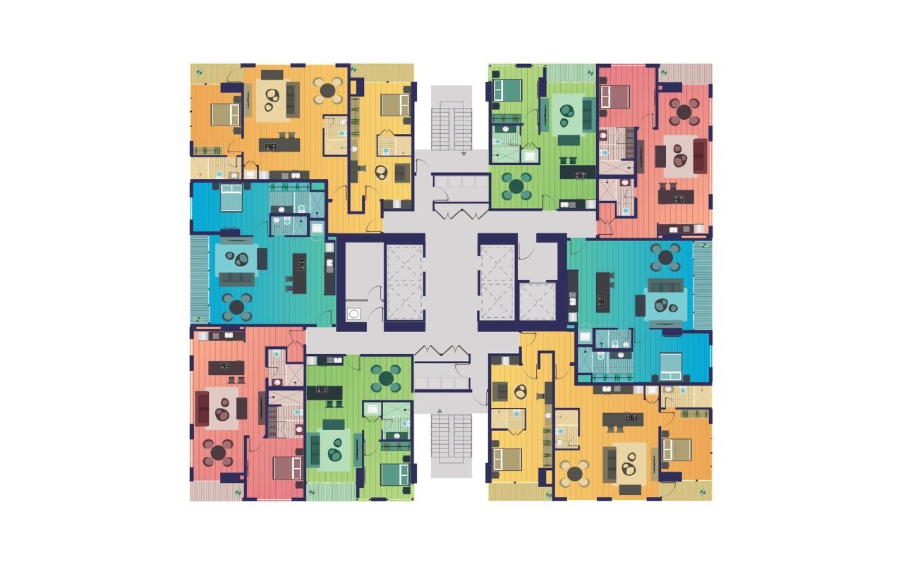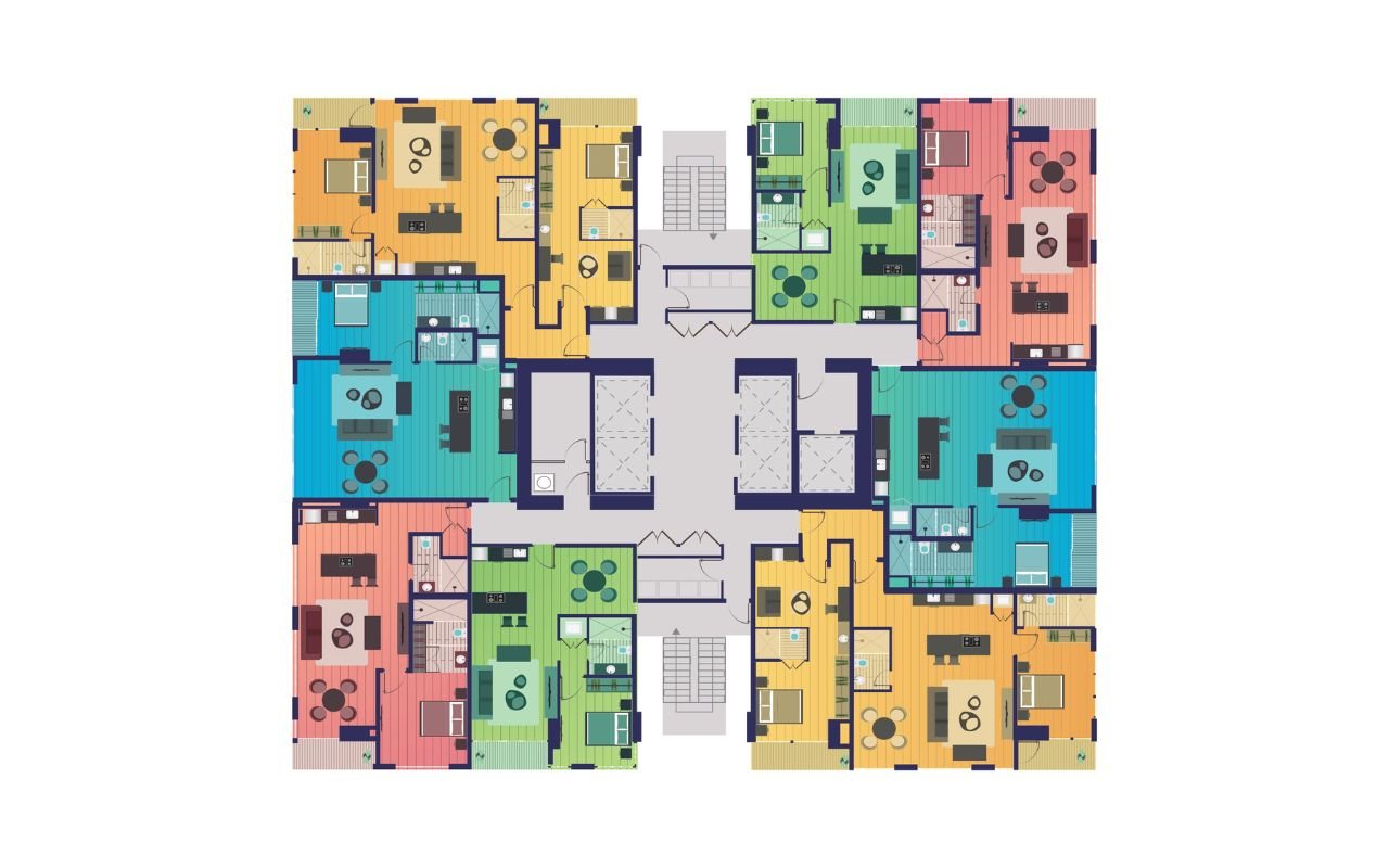 - 4 tipologías: 71 m² | 90 m² | 93 m² | 135 m² (2 recámaras)