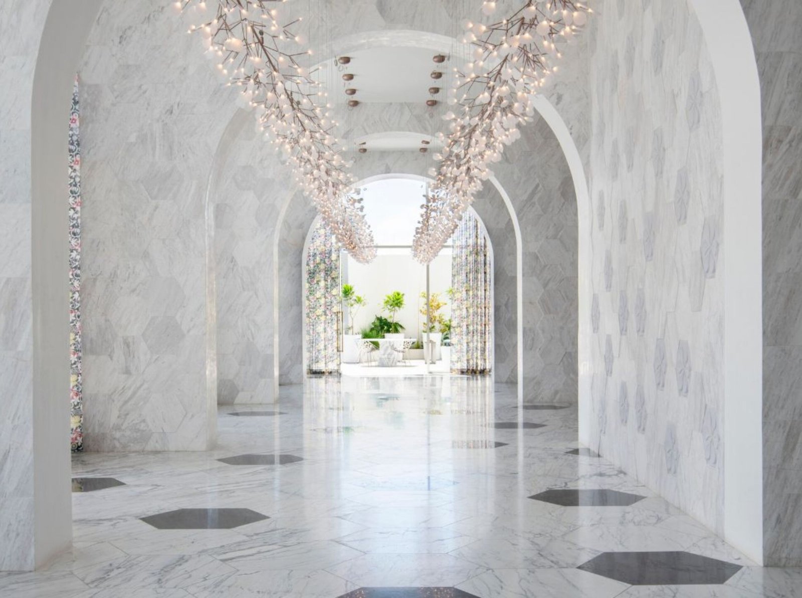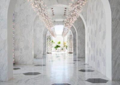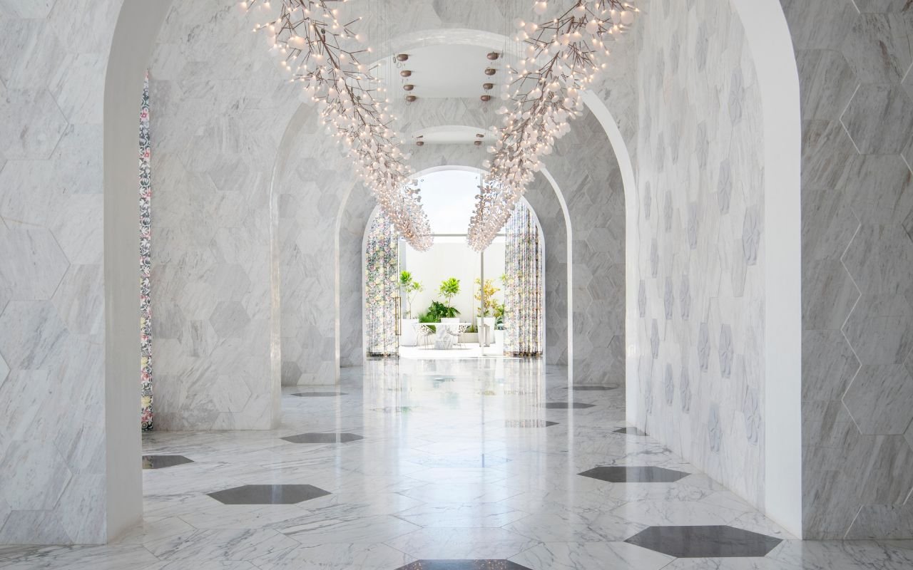 • Salón de eventos de lujo con acabados en mármol, lámparas tipo pétalos y ambiente sofisticado