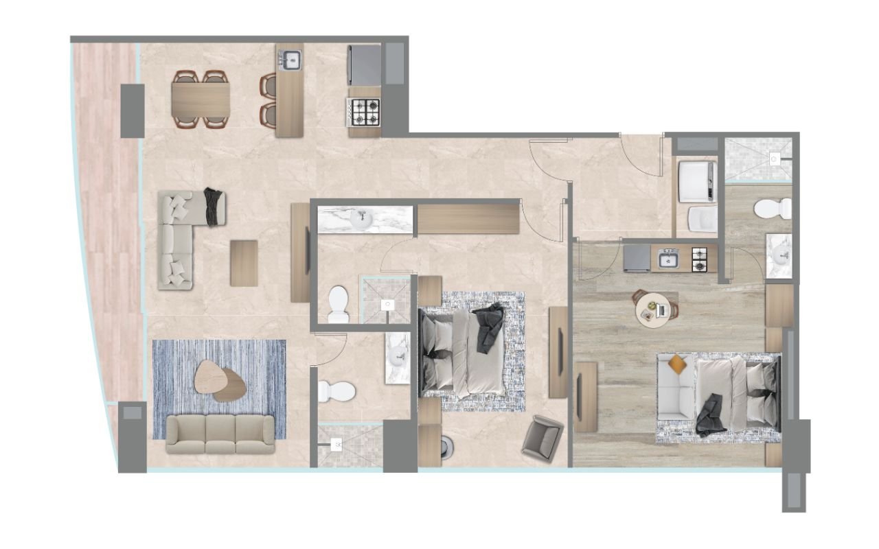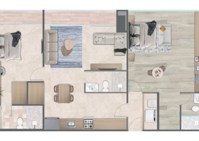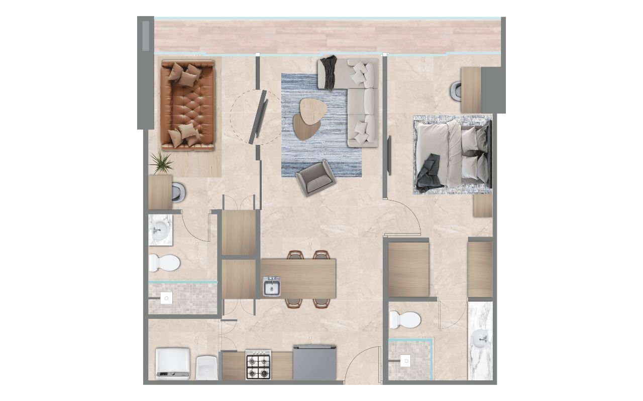 - 80 m² (861 sq. ft.): 1 recámara, espacio flexible tipo estudio, cocina moderna, sala acogedora, 1 baño completo, lavandería en unidad