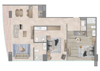 - 128 m² (1,377 sq. ft.): 2 recámaras, 3 baños, cocina moderna, balcón privado, sala espaciosa, área flexible y lavandería